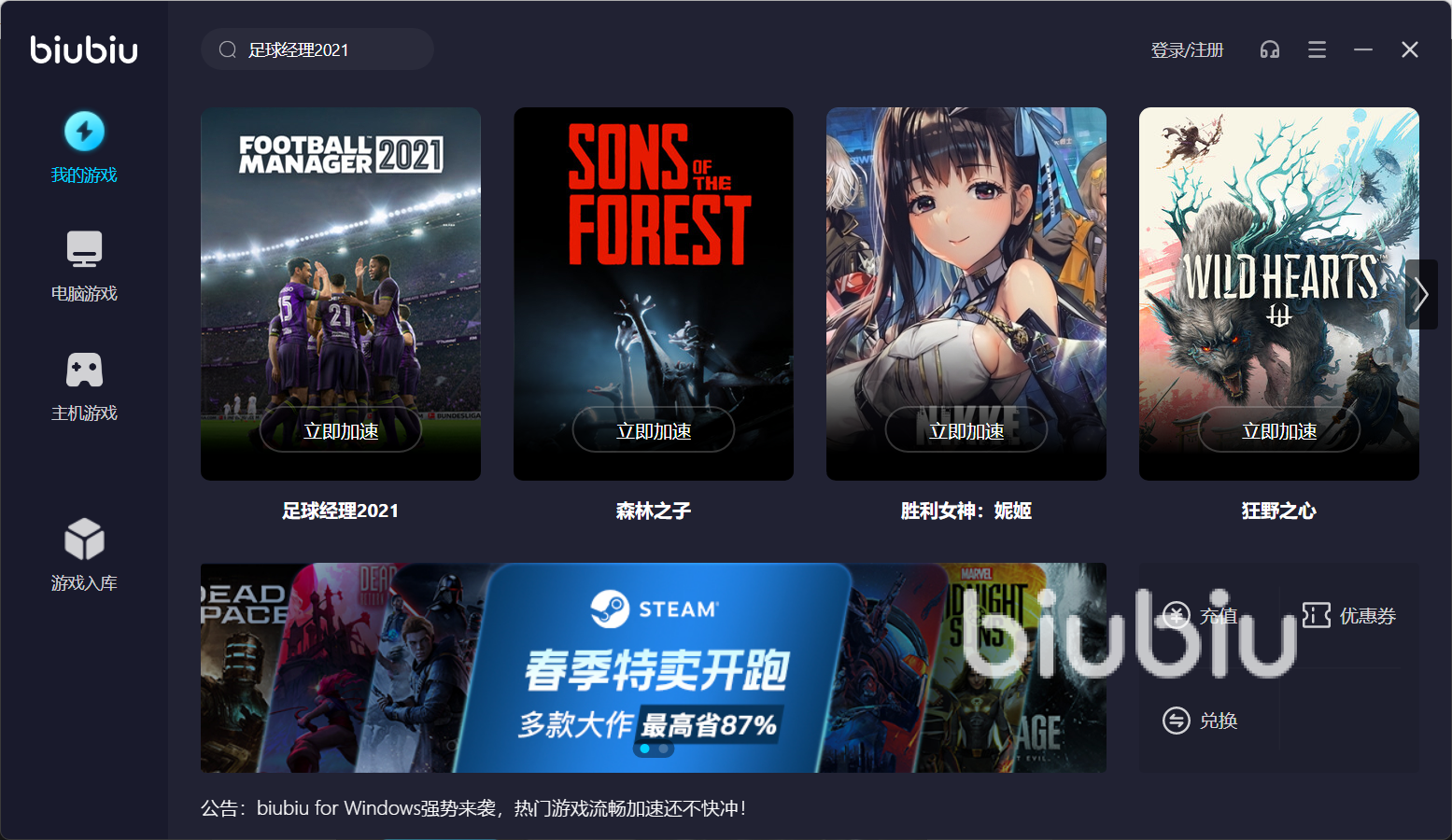 第一步,通過(guò)本文鏈接下載biubiu軟件安裝包,然后進(jìn)行安裝和用戶(hù)注冊(cè)、登錄。玩家們通過(guò)實(shí)名認(rèn)證,才能使用全部功能。biubiu隨時(shí)啟用和關(guān)閉,一鍵點(diǎn)擊即可,用戶(hù)不需要進(jìn)行多余的操作。它支持游戲數(shù)量多,覆蓋了兩萬(wàn)多款游戲,還支持多端口加速,匯集了PC端、STEAM端等。