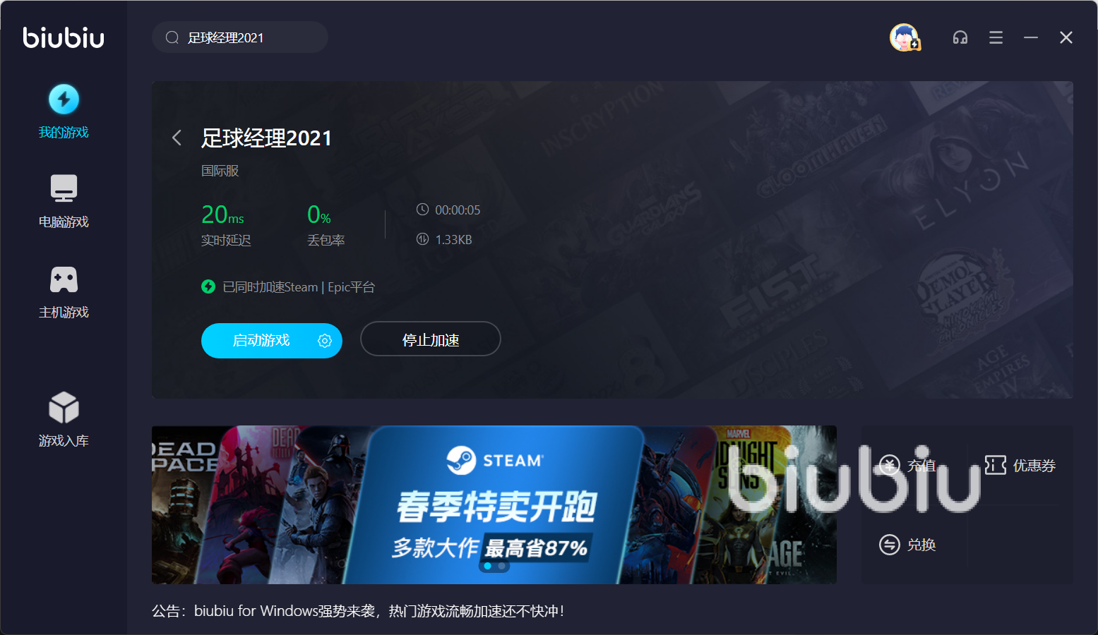 來(lái)源: 極光 作者: 檸檬 2023年03月27日 17:57足球經(jīng)理2021模擬真實(shí)足球俱樂(lè)部經(jīng)營(yíng)環(huán)境,它是呈現(xiàn)給足球迷的一件禮物,玩家開(kāi)始主教練之旅,運(yùn)籌帷幄戰(zhàn)術(shù)布局。但是遺憾的是,它運(yùn)行存在延遲、卡頓,需要搭配加速器。到底足球經(jīng)理2021加速器哪個(gè)好用?玩家們?cè)撊绾翁暨x呢?下面小編推薦一款好用的智能加速器——biubiu。
