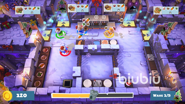 游戲采用的是關(guān)卡制模式,大家可以獨(dú)身一人和AI隊(duì)友一起合作,或者是叫上小伙伴通過緊密的配合共同完成冒險(xiǎn)。在游玩的過程中,大家需要跟隨系統(tǒng)給定的食物要求以及對(duì)應(yīng)的菜譜馬不停蹄地進(jìn)行食材的處理、搬運(yùn)、烹飪和提交。這些單個(gè)操作比較簡(jiǎn)單的步驟連在一起就難免讓人感到手忙腳亂了。除了合作闖關(guān)模式之外,本作還提供了對(duì)戰(zhàn)的模式,更是讓競(jìng)技性變得更強(qiáng)。不管是哪種模式其實(shí)都是帶有時(shí)長(zhǎng)的限制,更是要求大家不能浪費(fèi)一分一秒,所以擁有一個(gè)穩(wěn)定快速網(wǎng)絡(luò)環(huán)境的重要性就不言而喻了。