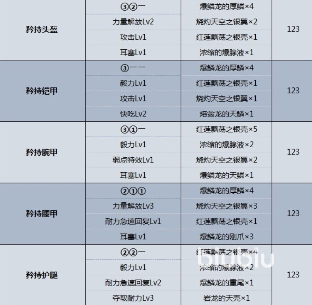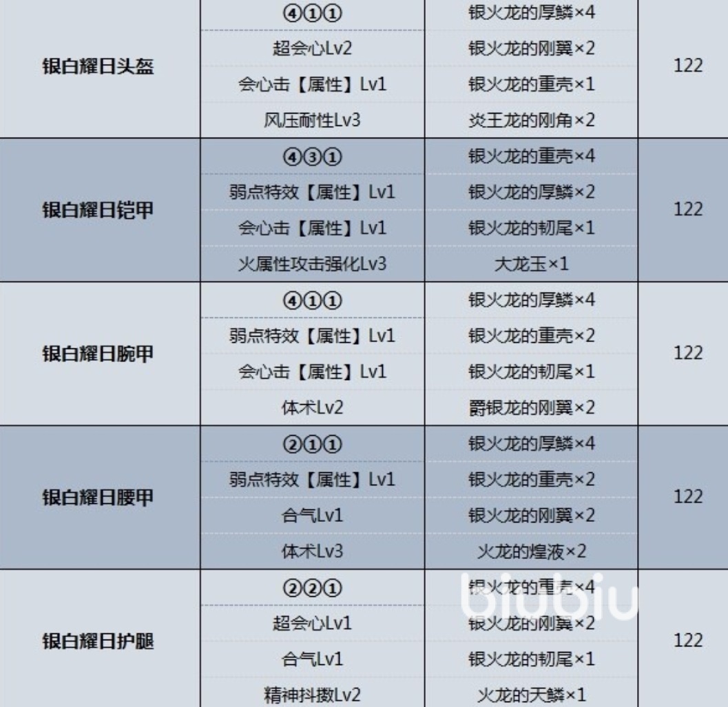 第4個(gè)是銀火龍,銀火龍防具的外觀和金火龍相似,不過散發(fā)的是銀白色的光芒,對應(yīng)的是銀白曜日系列防具。其中銀白曜日頭盔可以附加二級超會心,一級會心擊和三級風(fēng)壓耐性。銀白曜日鎧甲可以附加一級弱點(diǎn)特效,一級會心擊和三級火屬性攻擊強(qiáng)化。
