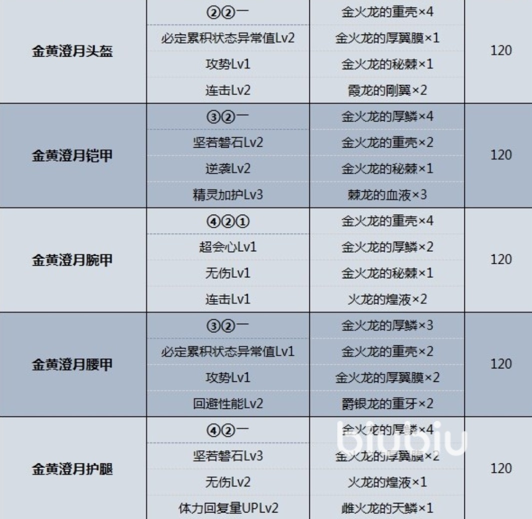 第3個(gè)是金火龍,金火龍防具的外觀金光燦燦非常炫酷,非常有土豪的風(fēng)范,對應(yīng)的是金黃橙月系列防具。其中金黃橙月頭盔可以附加二級必定累積狀態(tài)異常值和一級攻勢,二級連擊。金黃橙月鎧甲可以附加二級堅(jiān)若磐石,二級逆襲和三級精靈加護(hù)。