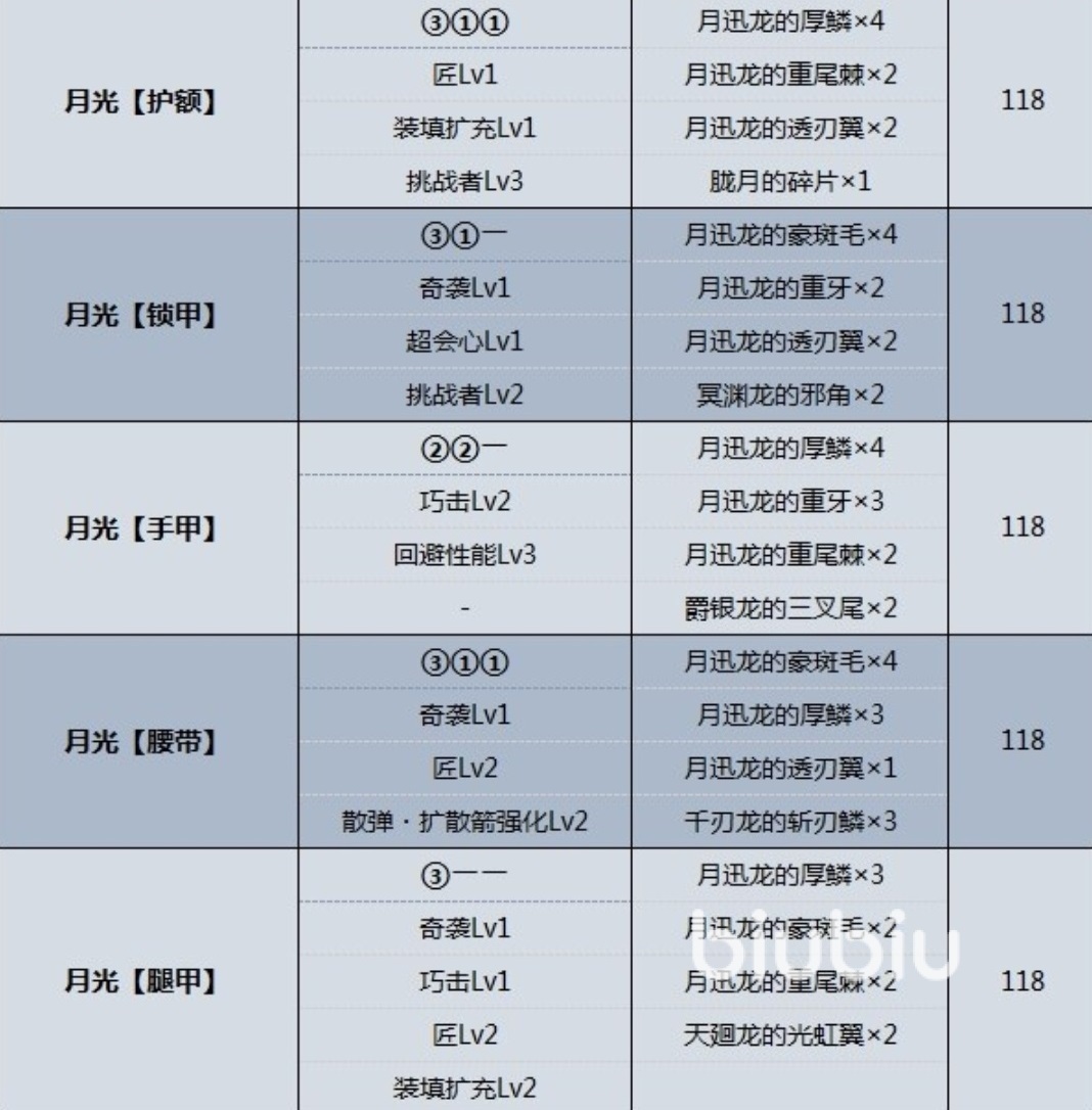 月光腰帶可以附加一級奇襲,二級匠和二級散彈-擴(kuò)散箭強(qiáng)化。月光腿甲可以附加其一級奇襲,一級巧擊,二級匠和二級裝填擴(kuò)充。這5件月光防具初始防御力都為118點(diǎn)。