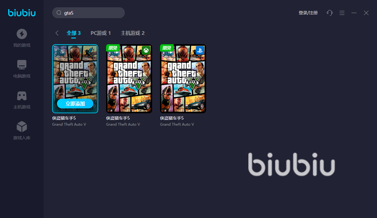 小編找的這款biubiu是能夠比較好的解決俠盜獵車手5游戲的出現(xiàn)的一些運營情況的,無論玩家是卡頓了還是閃退了一或者是游戲加載過慢,都可以用這個加速器。小編選擇biubiu除了因為基本的游戲問題它都能解決以外,還因為它有針對新人玩家的特殊福利,比如新人玩家在注冊之后,平臺會贈送24小時的會員給玩家體驗。而且平臺上游戲也很好添加,直接搜索名字就行了。