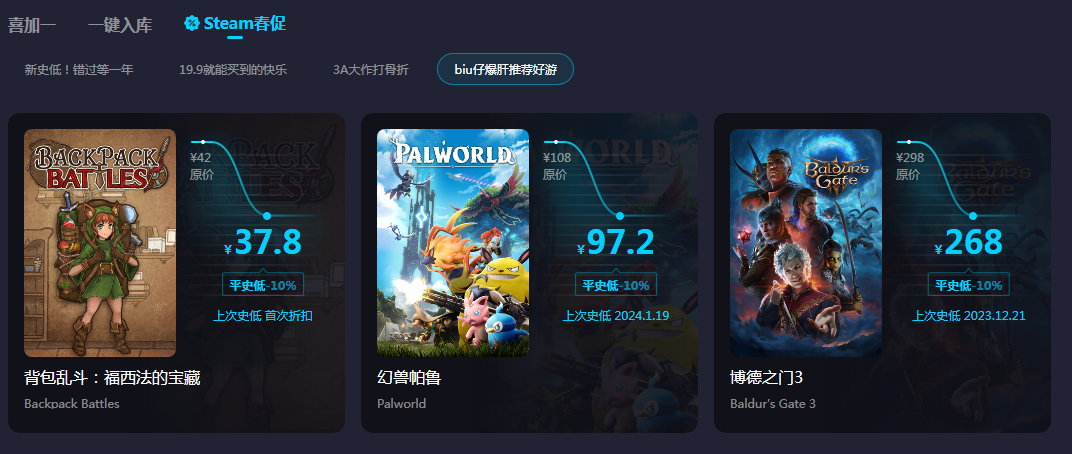biubiu知道大家都很喜歡steam游戲,又礙于囊中羞澀無(wú)法購(gòu)買太多。正好現(xiàn)在有steam春促活動(dòng),軟件幫大家收集整理了活動(dòng)清單,將值得購(gòu)買的、性價(jià)比高的游戲都整理出來(lái),大家進(jìn)入專區(qū)就能了解。每款游戲的價(jià)格是多少,降價(jià)幅度是多少都能一目了然,還有biu仔爆肝推薦的優(yōu)質(zhì)游戲,大家千萬(wàn)不要錯(cuò)過(guò)。