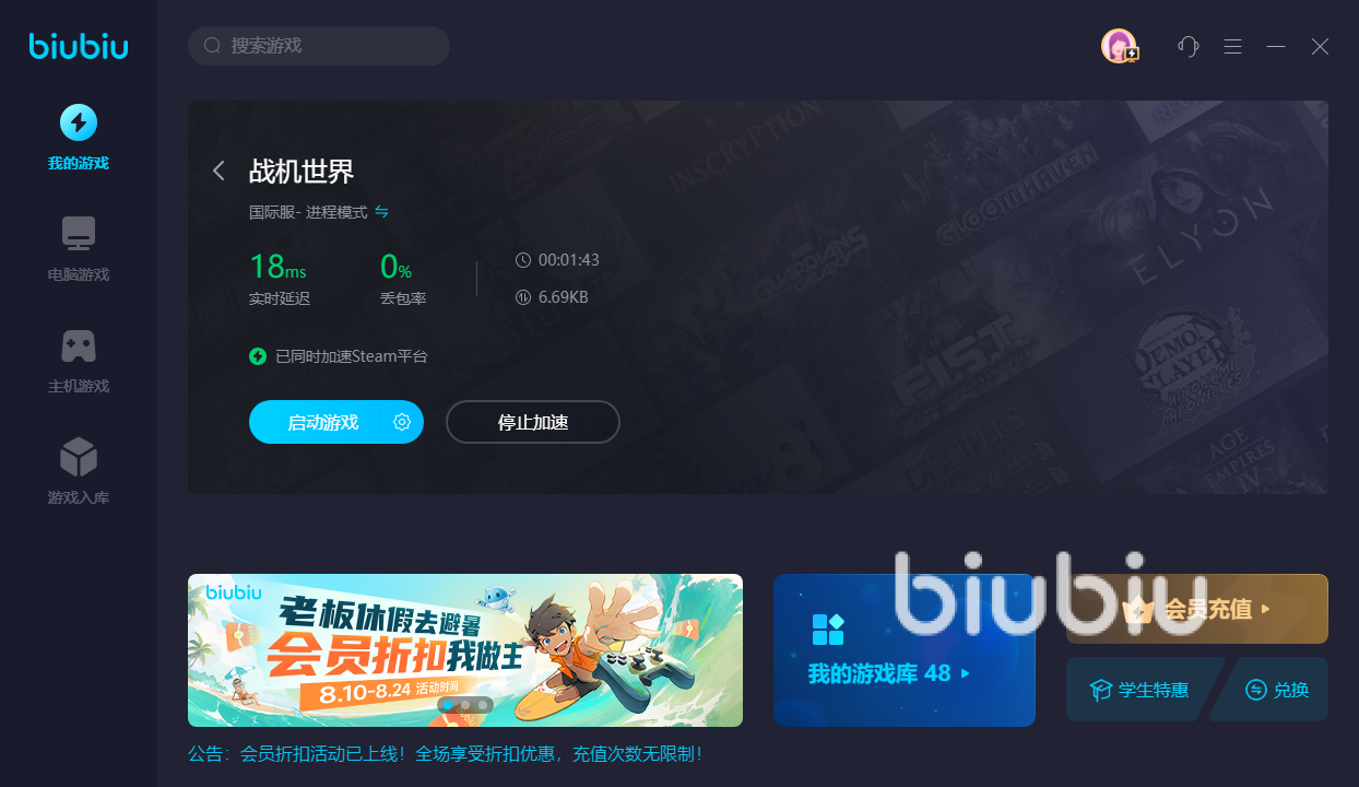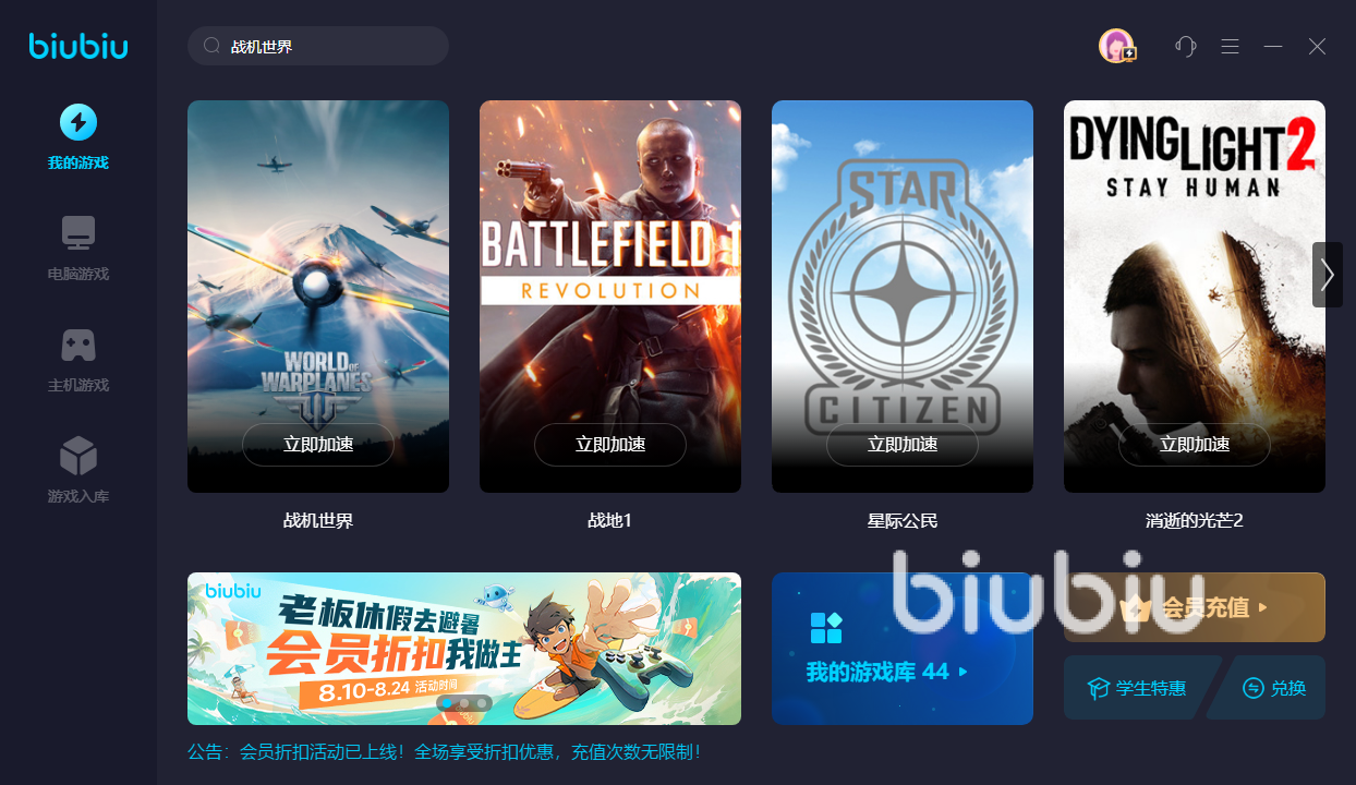 biubiu加速器能加速的游戲不僅有像戰(zhàn)機世界這樣的端游,還能加速Xbox的游戲和手游,并且如果大家選擇游玩的是國服的游戲,或者是蒸汽平臺和暴雪平臺的游戲,現(xiàn)在都可以享受到顯示免費加速福利,不僅如此,第一次使用biubiu的玩家們還能享受到24小時免費加速體驗的福利。