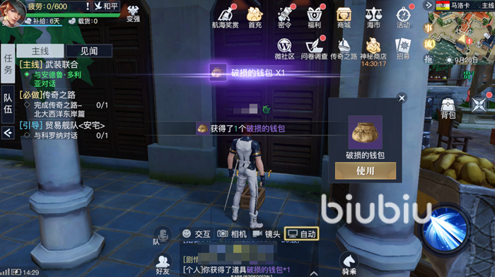 從酒館出來之后西邊有一棟建筑叫做交易所,大家打開地圖上也可以通過圖標來找到交易所。在交易所旁邊有一棟房子的兩個柱子中間可以找到一個箱子,打開之后就可以破損的錢包。
