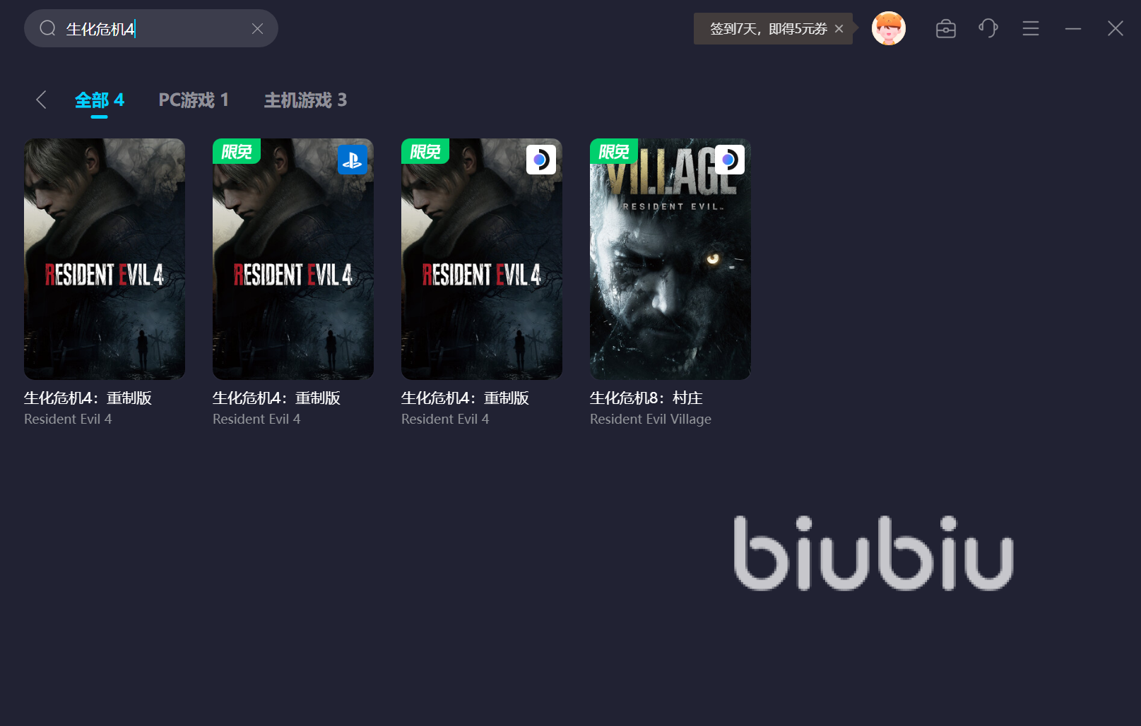 多年的運行早就讓biubiu擁有了大量忠實粉絲,官方為了感激大家的支持和肯定特別給新注冊的用戶準備了24小時限免加速時長體驗,通過這個機會可以簡單的了解下biubiu加速器的各項功能和操作方法,然后帶著【biubiu不卡頓】暗號口令去兌換72小時免費加速時間,領(lǐng)取之后就可以在搜索界面輸入生化危機4重制版這款游戲了,細心的伙伴會發(fā)現(xiàn)除了pc端之外還支持其他平臺版本。