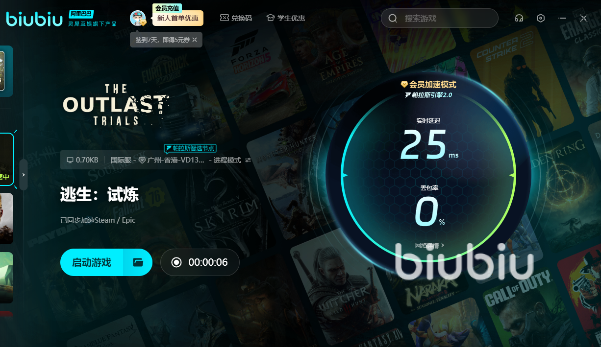 逃生試煉如今還沒有上線國服,要是為了被送到恐怖的試煉場景里面。你就需要借助biubiu,網(wǎng)絡優(yōu)化后,才能進入這一場試煉,并開啟潘多拉的魔盒。新用戶的話可領取24小時的免費加速,另外新老用戶輸入【biubiu不卡頓】,便可額外獲得三天免費加速。如果逃生途中太卡的話,就不能及時躲避鬼怪的追蹤并被危險所吞沒。用了加速器后,自然不會卡住,讓你可以安全無恙的逃離現(xiàn)場。