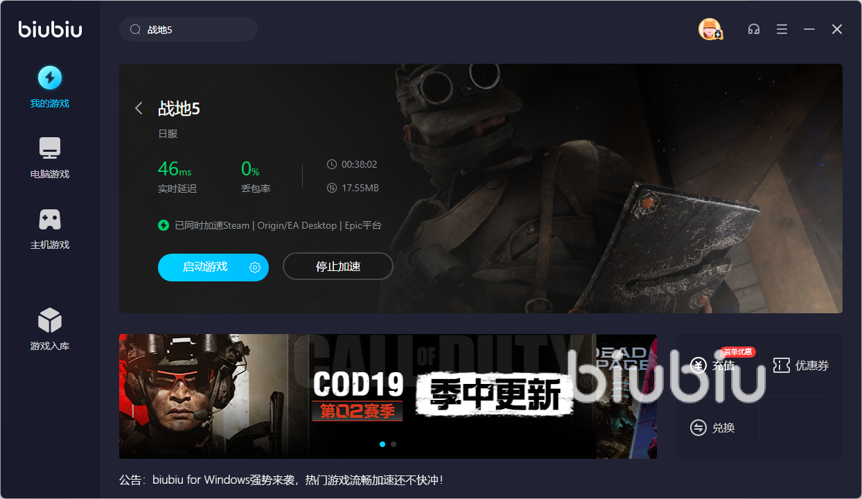 Biubiu加速器擁有著與其他加速器想比,最便宜的價(jià)格,連續(xù)包月僅需10元/月,季卡,年卡買的越多,享受的優(yōu)惠就會(huì)越多,注冊(cè)即送24小時(shí)的優(yōu)惠,可謂是福利滿滿呀!同時(shí),biubiu加速器擁有全網(wǎng)最先進(jìn)的節(jié)點(diǎn)選擇系統(tǒng),在我們的好朋友們還在為手動(dòng)選擇哪個(gè)節(jié)點(diǎn)而苦惱不已的時(shí)候,biubiu加速器已經(jīng)為我們提供了最佳的網(wǎng)絡(luò)節(jié)點(diǎn)進(jìn)行游戲啦!小伙伴們是不是已經(jīng)迫不及待了呢?別急,接下來(lái)由小編來(lái)為大家簡(jiǎn)單講解一下使用biubiu加速器加速戰(zhàn)地5的方法哦!