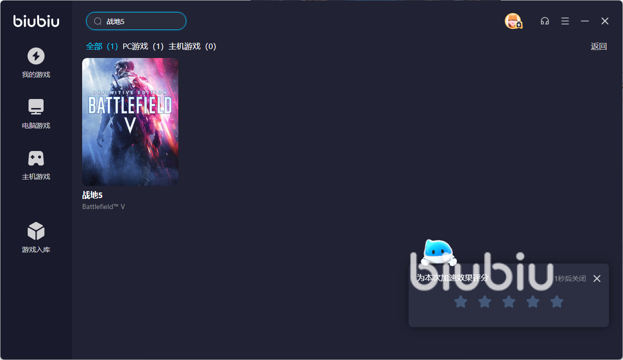 之后我們?cè)?span>biubiu系統(tǒng)自帶的游戲搜索界面搜索戰(zhàn)地5這款游戲,戰(zhàn)地5就會(huì)出現(xiàn)在我們的選擇界面啦,點(diǎn)擊添加即可將戰(zhàn)地5加入我們的游戲庫(kù)之中哦~