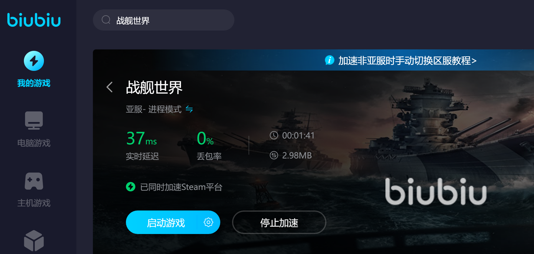 然而戰(zhàn)艦世界中如好萊塢電影般高清的畫質(zhì)、震撼的音效等特點,導(dǎo)致了它占用的內(nèi)存是比較大的,所以有部分玩家反應(yīng),在游戲過程中會出現(xiàn)掉線的情況,這就讓玩家的游戲體驗大打折扣了,為此,小伙伴們最好可以提前下載一下biubiu加速器這一軟件,該APP能夠有效解決網(wǎng)絡(luò)卡頓、掉線、延遲等一系列問題,為玩家提供一個流暢、穩(wěn)定的網(wǎng)絡(luò)連接,讓童鞋們得以專注于游戲本身,不再因為網(wǎng)絡(luò)問題感到十分困擾。