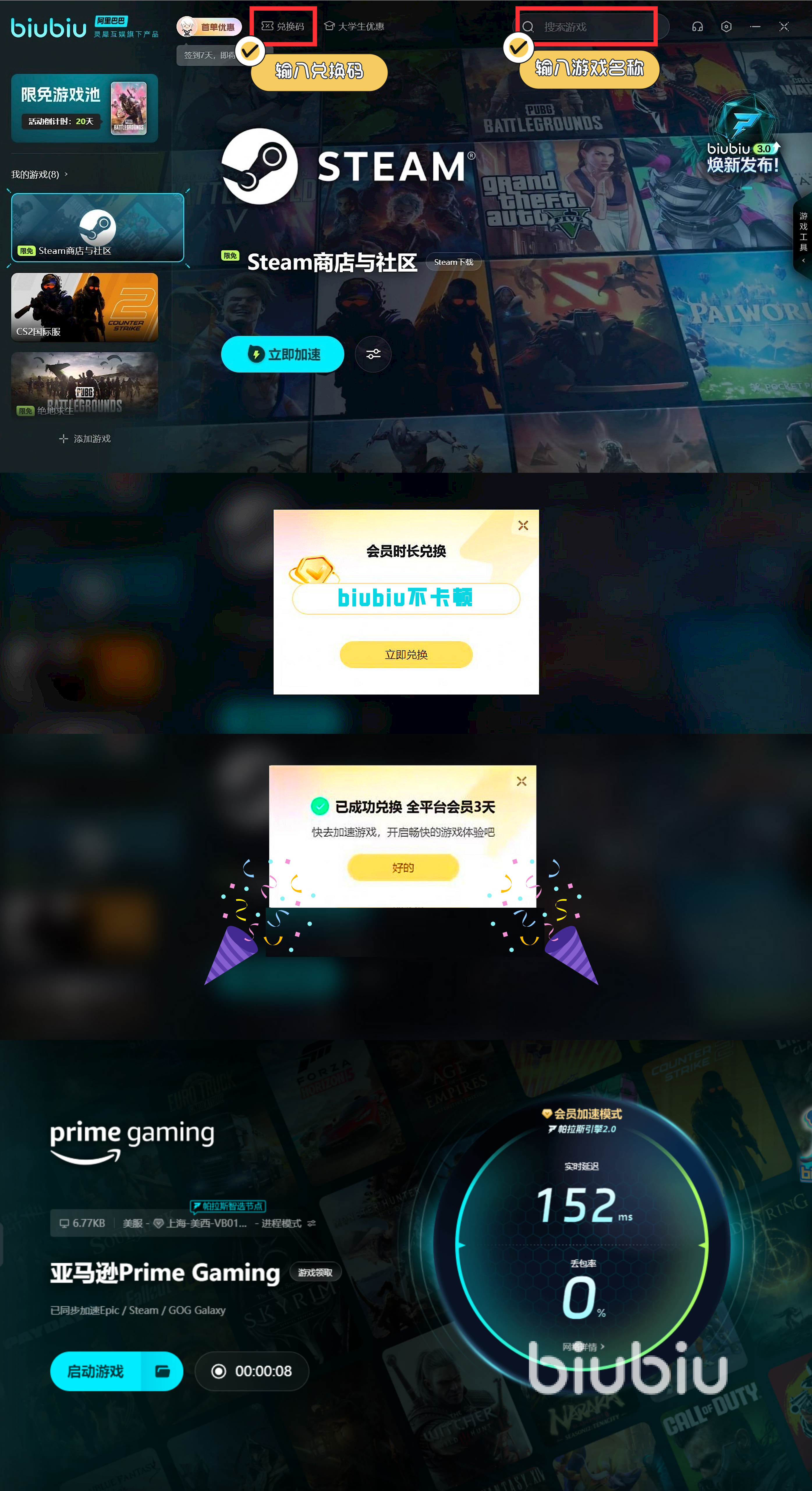 biubiu現(xiàn)在還有福利可以領(lǐng)取呢,新人登錄就可以得到免費(fèi)的24小時(shí)加速時(shí)間哦,加上兌換碼【biubiu不卡頓】新老用戶都能用,兌換到額外的72小時(shí)加速時(shí)間后,新人可以用96小時(shí)免費(fèi)加速時(shí)長呢。大家趕緊注冊賬號,按照下圖的流程領(lǐng)取免費(fèi)時(shí)間,加速自己的網(wǎng)絡(luò)吧。