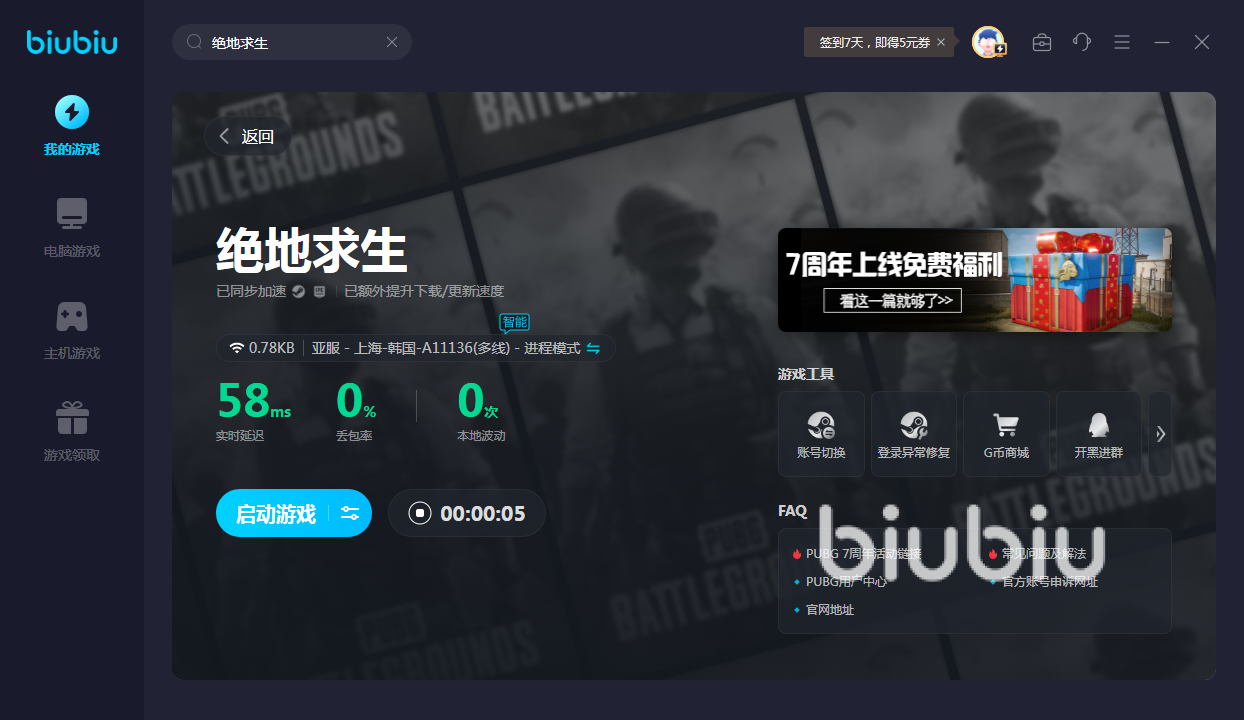 在絕地求生這款游戲中,玩家可以單人也可以組隊(duì)方式加入大戰(zhàn)場,這里有眾多玩家在一起進(jìn)行競技,根據(jù)自己戰(zhàn)術(shù)需求選擇不同降落地點(diǎn),可以直接去資源豐富的地方,落地就直接剛槍,這樣可以獲得豐厚物資。也可以去人煙稀少的地方減少競爭,慢慢發(fā)育起來再進(jìn)入決賽,但無論選擇哪一種戰(zhàn)術(shù),網(wǎng)絡(luò)都是很重要的方面,因?yàn)橛螒虮旧砭腿菀壮霈F(xiàn)卡頓,再加上服務(wù)器人數(shù)過多,更是對網(wǎng)絡(luò)造成極大壓力。一旦延遲高或是卡頓,就有可能直接被敵人淘汰,所以加速器非常重要。小編推薦大家使用biubiu,這是一款老牌加速軟件,操作簡單,性能優(yōu)異,現(xiàn)在加入還有福利可以領(lǐng)取。