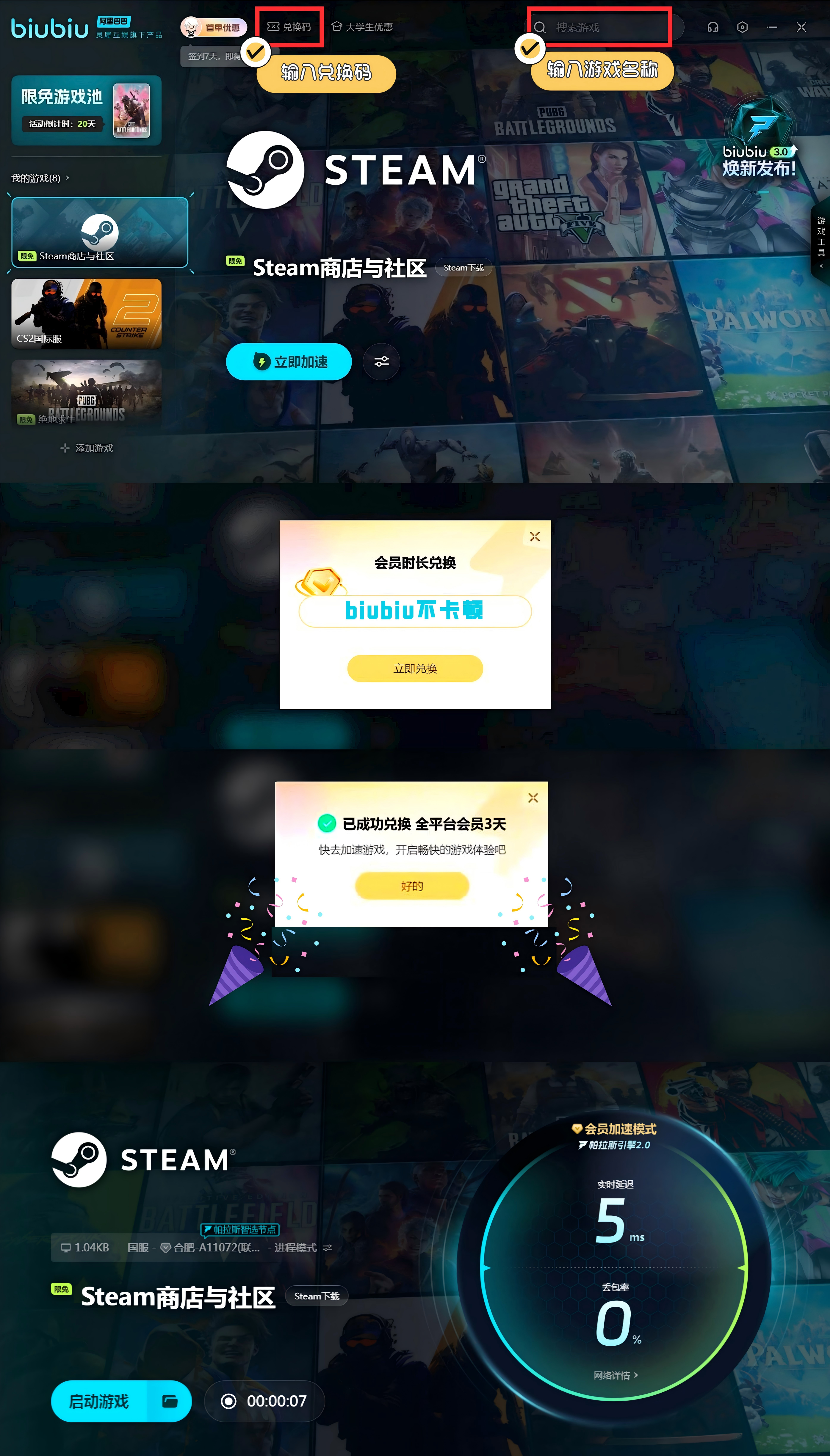 現(xiàn)在新用戶使用biubiu加速器直接就可以獲贈24小時免費加速時間,等新老用戶用兌換碼【biubiu不卡頓】再換取72小時加速時長之后,新用戶們就可以得到96小時免費時間啦,還是很充足的。