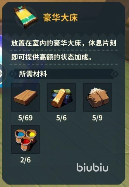 1、三級豪華大床:所需材料為77個木材、6個布料、9個獸皮、6個顏料,這個獸皮只能通過牧場中的“猛獸牧場”來獲取,需要用到狐貍和狼的。