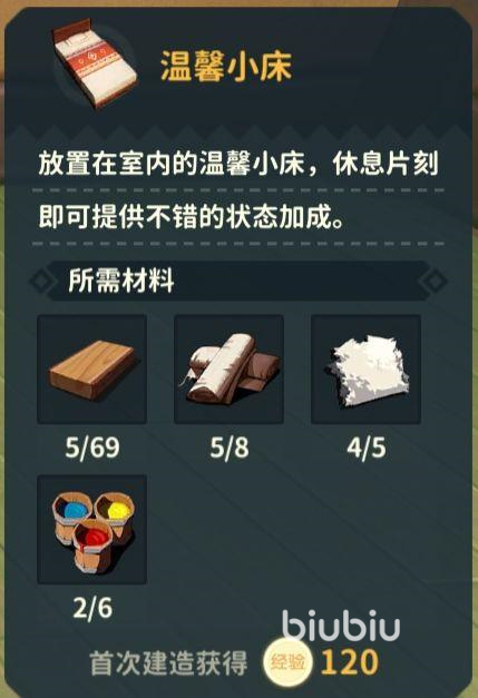 2、二級溫馨小床:所需材料為69個木材、8個布料、5個皮、6個顏料,皮是用羊毛來加工獲取的。