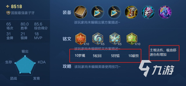 這一系列的符文,主要是提升法術(shù)攻擊,吸血,冷卻時(shí)間。這套銘文,讓姜子牙成為了一個(gè)很麻煩的消耗者,姜子牙可以肆無忌憚的使用吸血術(shù),可以讓他的魔法傷害大幅度增加,而冷卻時(shí)間的縮短,也會(huì)讓姜子牙的消耗更加頻繁,總之,“消耗”這個(gè)詞,就是為了配合姜子牙的消耗而設(shè)計(jì)的。