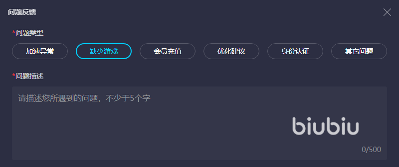 說到這里,在為一些喜歡玩小眾游戲的玩家一個(gè)建議,如果大家在平臺(tái)當(dāng)中沒有找到自己準(zhǔn)備加速的游戲時(shí),各位可以在線通過問題反饋的方式,將需要進(jìn)行加速的游戲名稱進(jìn)行反饋,平臺(tái)隨后在處理的過程當(dāng)中,就會(huì)為大家開放更合適的加速選擇,從而滿足每一個(gè)玩家不同的游戲需求。