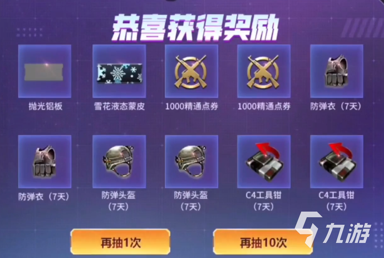 獎(jiǎng)池中的最后7款道具都比較常見,就簡(jiǎn)單介紹一下了。它們分別是拋光鋁板、雪花液態(tài)蒙皮、王者之骰*3,188精通點(diǎn)、1000精通點(diǎn)、防彈衣7天、防彈頭盔7天,以及C4工具鉗7天。