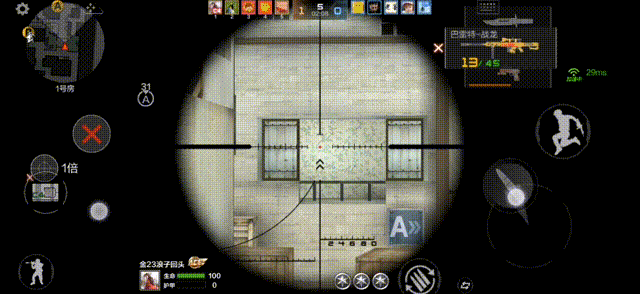 還有一個(gè)點(diǎn)位,就是樓梯側(cè)面斜對(duì)著門口的地方。很多小伙伴喜歡正對(duì)著樓梯架點(diǎn),殊不知這樣反而容易被敵人給針對(duì)。因此我們只需要像下圖方式架點(diǎn),等待敵人露出身位就可以開槍了。