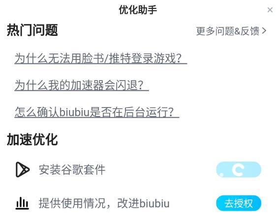 加速成功界面的右上角,有一個優(yōu)化助手,用戶可以使用這個功能,檢測自己是否安裝了谷歌套件。其中還提供了一些熱門問題的解決方案,幫助用戶輕松地完成網(wǎng)絡(luò)優(yōu)化。