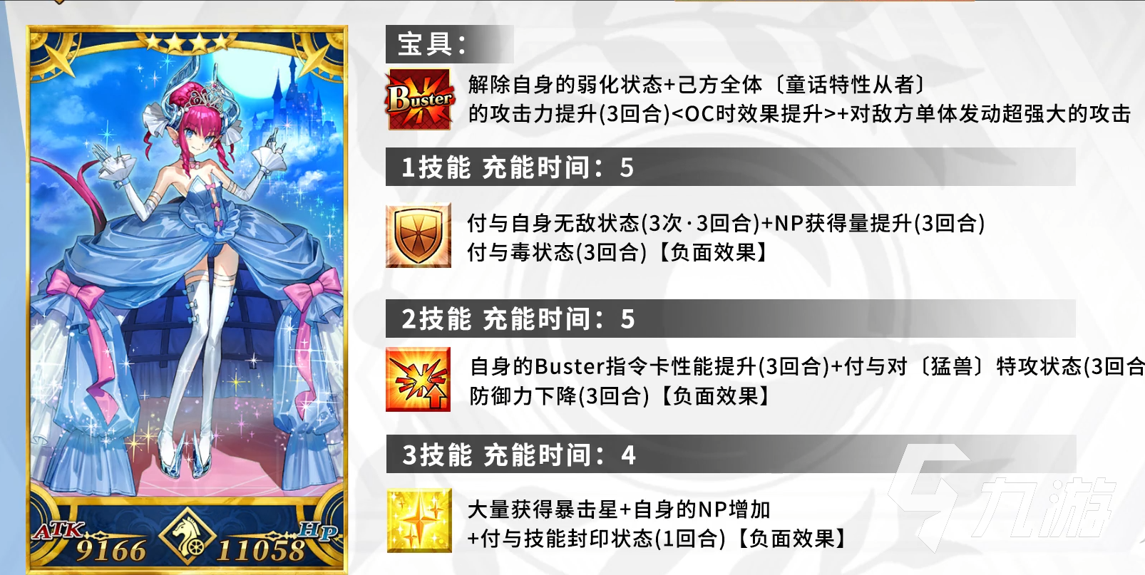 本次贈送的從者為4星騎階從者伊麗莎白灰姑娘,簡稱灰姑娘。寶具為紅卡單體寶具,強度不高,有意思的是三個技能都有負面效果,整個游戲是獨一份。但是有寶具的解弱體,并不影響使用。不過角色的語音和演出效果極其的魔性,對于部分的御主來說相當(dāng)?shù)纳项^。