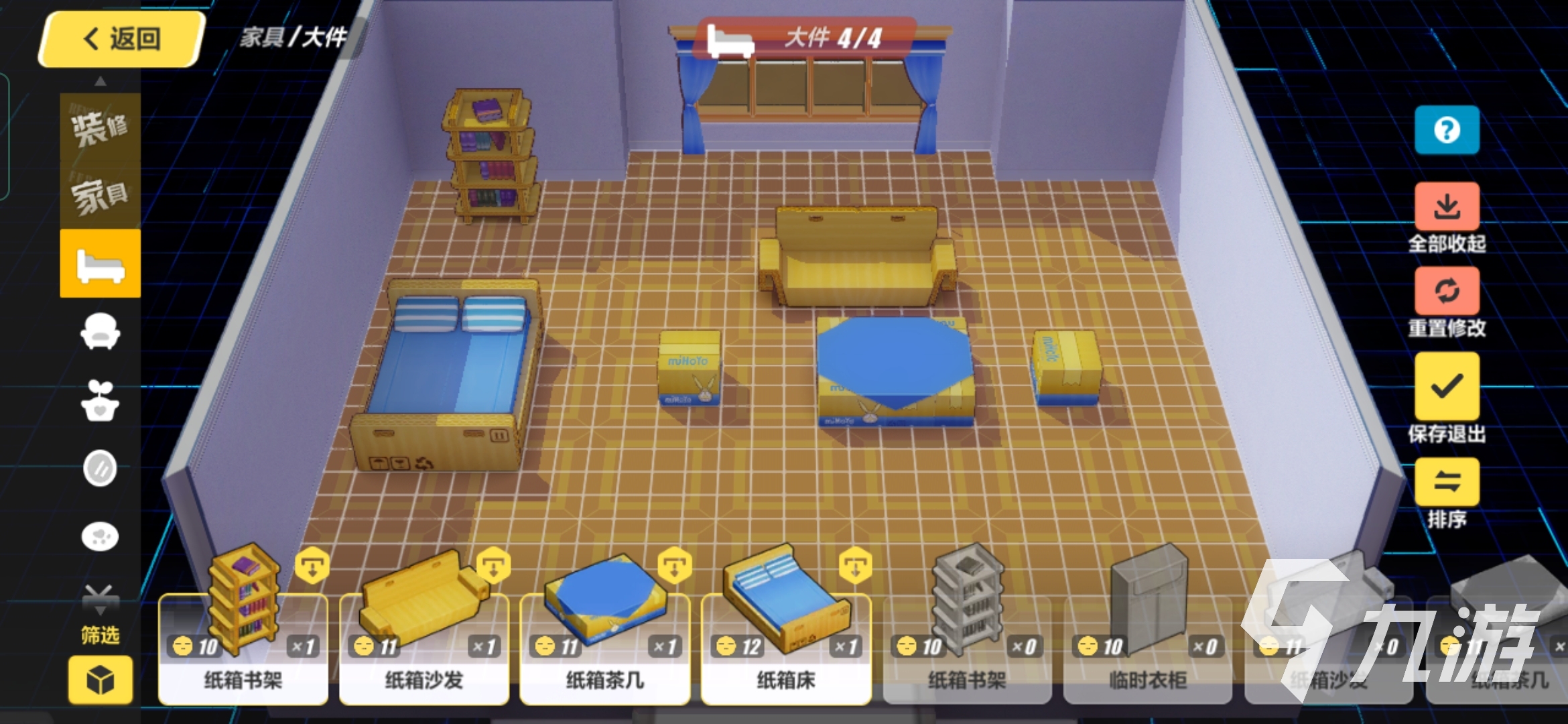 比如在這里,玩家要布置一個(gè)紙箱沙發(fā)的話,就可以直接點(diǎn)擊紙箱沙發(fā),當(dāng)玩家點(diǎn)擊了紙箱沙發(fā)的時(shí)候,就會(huì)發(fā)現(xiàn)紙箱沙發(fā)已經(jīng)到房間里面了,這時(shí)候玩家只需要調(diào)整沙發(fā)的位置和朝向就行了!