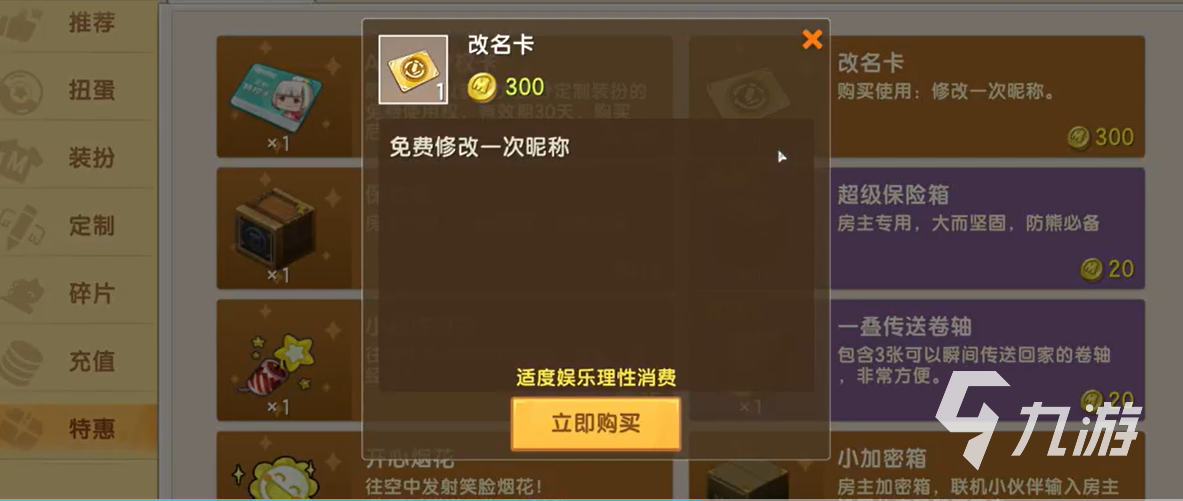 免費改名次數(shù)用完了之后,如果玩家還想要改名字的話怎么辦呢?別著急,游戲推出了一個改名的道具,價格也不是很貴,三百迷你幣就可以搞定。需要的玩家直接在界面找到商店的入口,然后再左下角找到特惠欄目的選型,直接就在右側(cè)彈出帶有改名卡的選項界面,點擊進行購買就可以了。