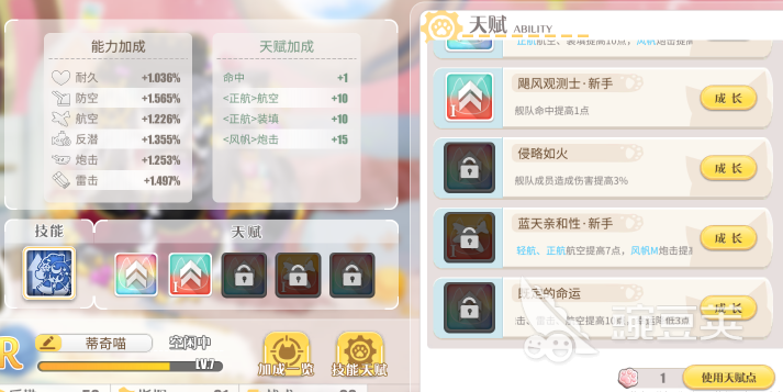 技能方面“未了的傳奇”可以提升大炮的炮擊屬性,所在隊伍里有安妮女王的時候,入戰(zhàn)可以觸發(fā)一輪特殊彈幕,一場一次。從技能與天賦來看,可以作為航母隊的過渡或者備用貓,與目前頂配航母貓來說有一點差距,優(yōu)勢在于不用洗,節(jié)省資源。