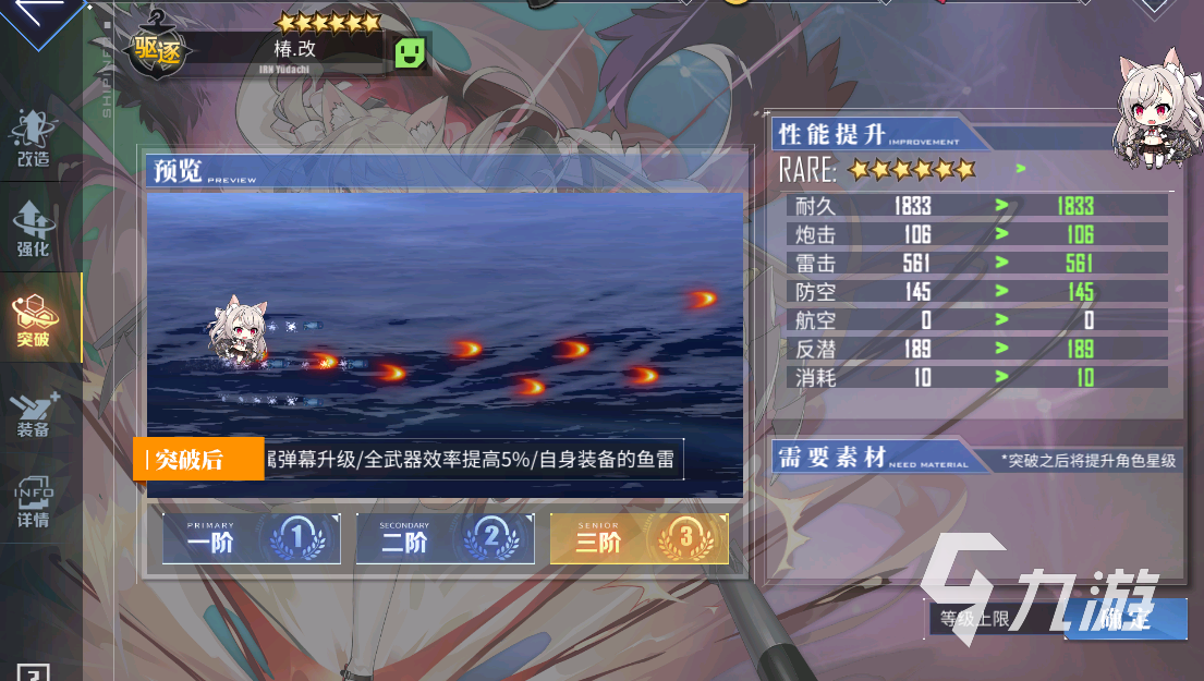 首先,我們有必要了解的是夕立改造后有哪些改動,屬性方面耐久提升165點(diǎn),雷擊提升40點(diǎn),炮擊提升40點(diǎn),機(jī)動提升40點(diǎn)。主武器效率提升15%,魚雷效率提升10%。