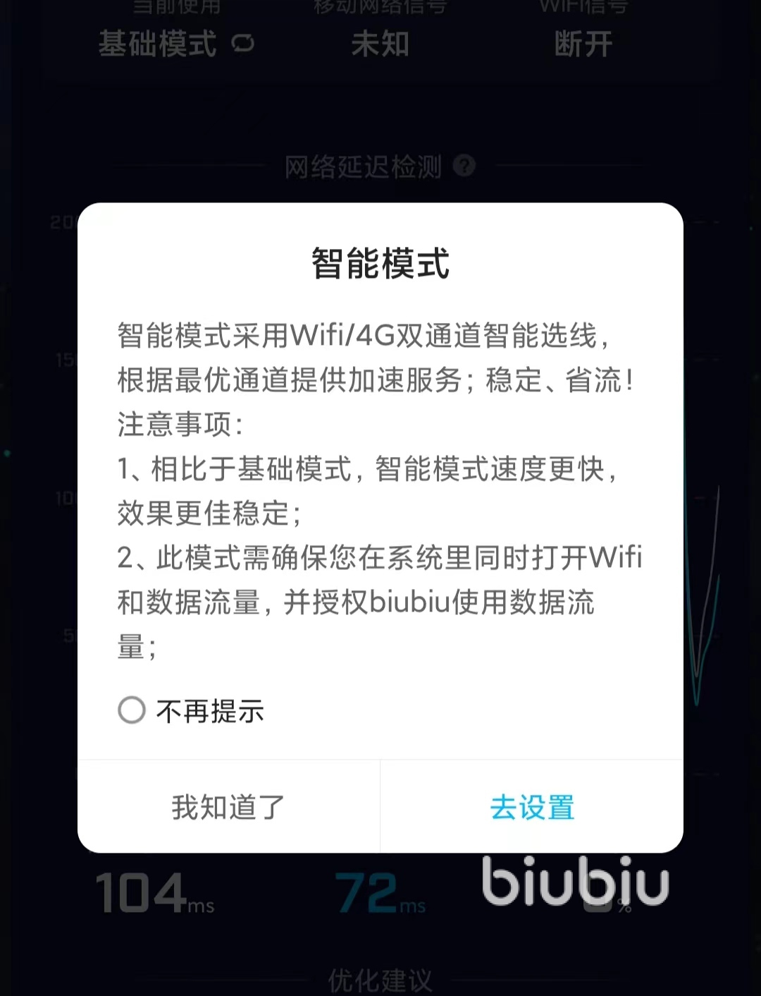 在加速界面中,玩家可自行更改加速模式,點擊加速界面下方的基礎(chǔ)模式循環(huán)按鈕,再點擊智能模式旁邊的去設(shè)置按鈕即可,點擊后玩家會看到提示彈窗。