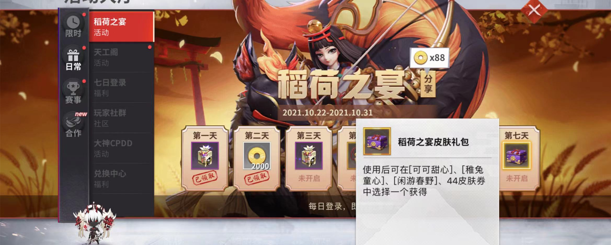 同時(shí)分享稻荷之宴還能得到88個(gè)金幣,切記,千萬(wàn)不要斷簽,否則玩家們要多等一天,對(duì)于有些新手來(lái)說(shuō)可能找不到獲取的具體位置,小編來(lái)告訴玩家們?cè)趺床僮鳎紫?,點(diǎn)擊右上角的活動(dòng),里面會(huì)有限時(shí),日常,賽事,合作四個(gè)系列的大型活動(dòng),選擇日常進(jìn)入,第一個(gè)就是稻荷之宴活動(dòng)。