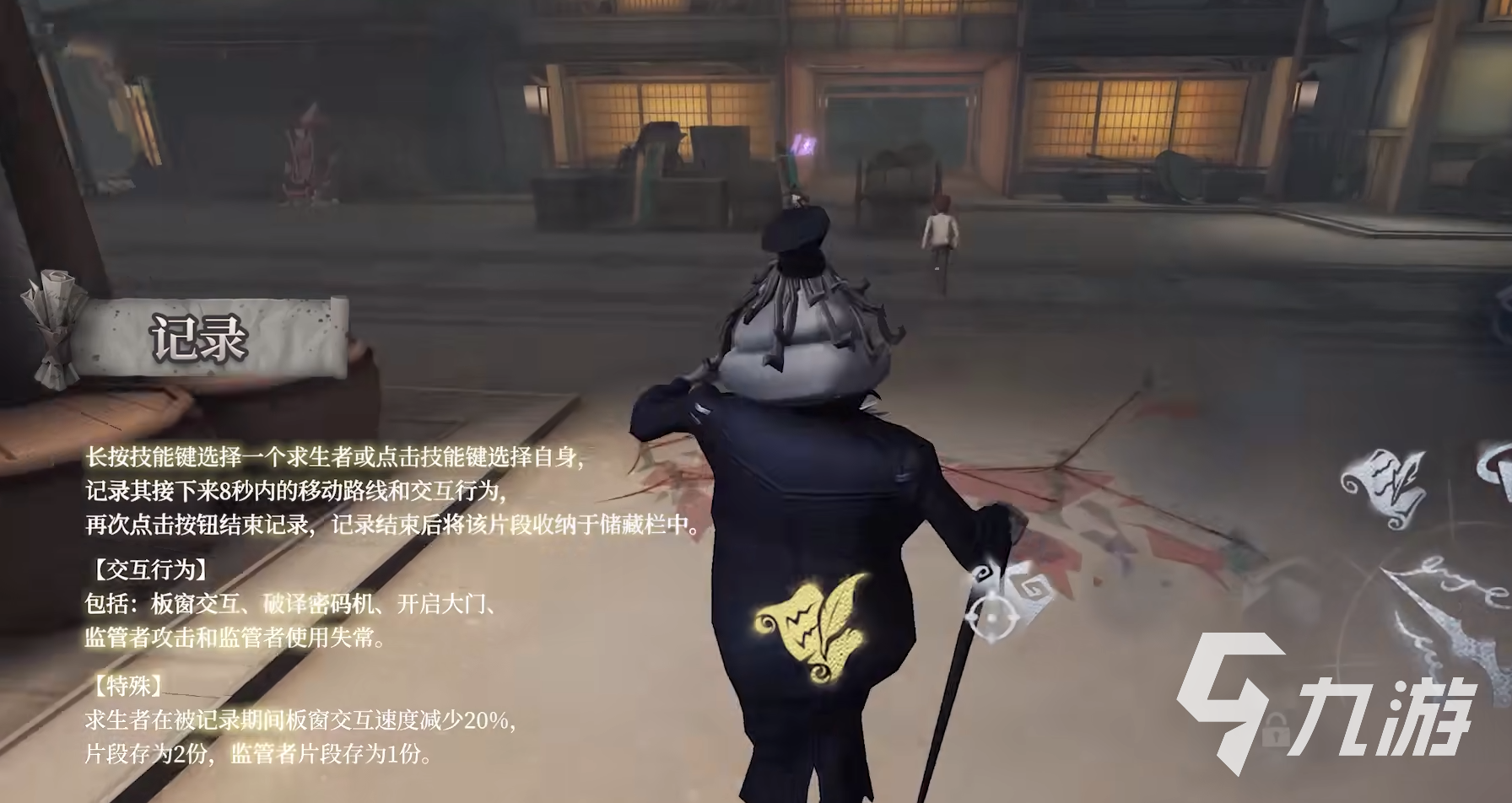 【記錄】:該技能有兩種釋放方式,點按是對自己使用,長按則是對逃生者使用,然后可以記錄其8s時間之內(nèi)的行為,將這個時間段目標(biāo)人物的行動收藏起來,求生者如果被記錄的話其板窗交互速度將會降低20%。