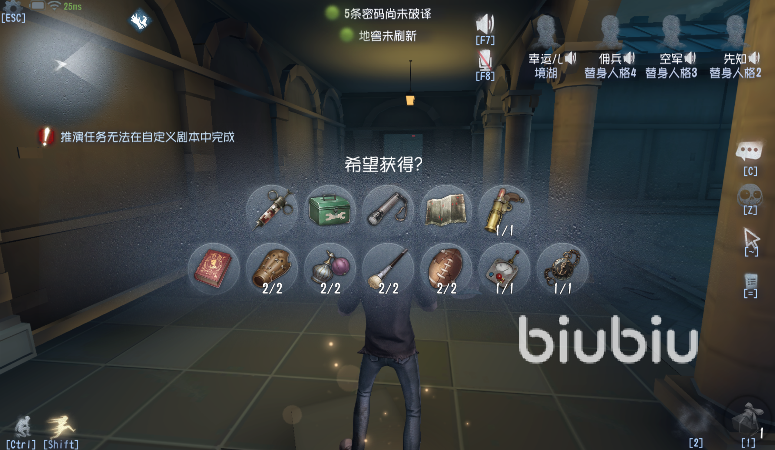 在開局的時候我們可以直接使用技能來召喚一件物品,當(dāng)這次沒有召喚選中物品的時候下一次就會必中,所以小編建議大家多去摸箱子,選一些好用的物品給隊(duì)友。幸運(yùn)兒本身就是一個輔助類的逃生者,他的玩法就是使用自己技能來摸箱子,拿到各種物品之后去溜監(jiān)管者保證其他逃生者能夠安心破譯密碼。