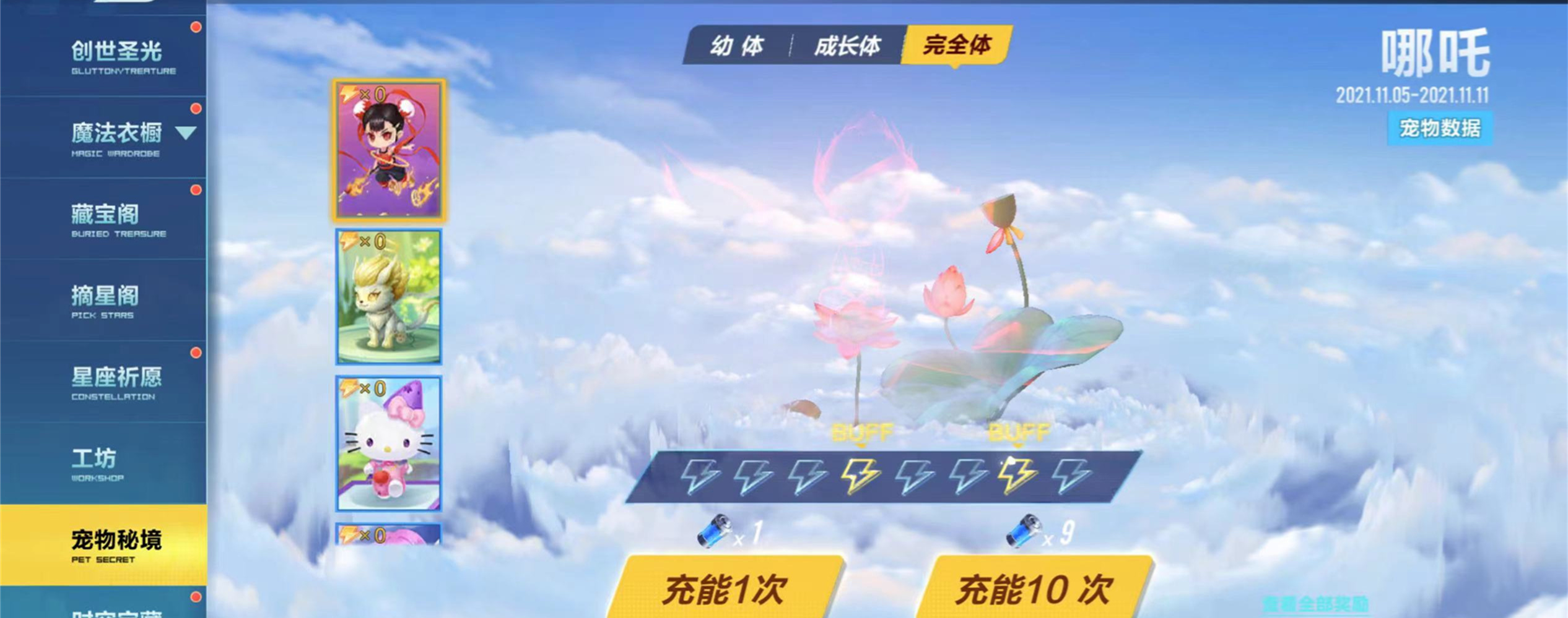 這樣就直接跳轉(zhuǎn)到寵物秘境了,有些新手玩家在尋寶功能里面找的很麻煩,在商城跳轉(zhuǎn)就可以,哪吒分為幼體,成長(zhǎng)體以及完全體,需要用充能的形式來(lái)進(jìn)行獲取,玩家需要用寵物能量道具來(lái)進(jìn)行抽取,充能1次消耗1個(gè)寵物能量道具,充能10次可需要9個(gè)寵物能量道具,玩家每充能一次,界面中的閃電符號(hào)就會(huì)亮起來(lái),直到爆滿進(jìn)入下一階段的成長(zhǎng)模式,幸運(yùn)的玩家可以直接獲取成長(zhǎng)體,完全體小編目前還沒(méi)有看見(jiàn)有獲得的。