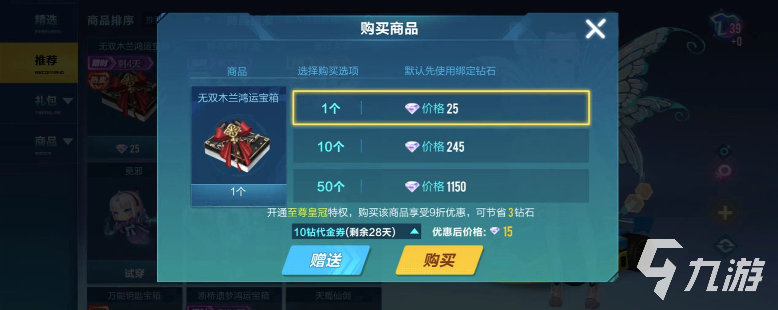 購買方式只需要用鉆石,玩家需要選定購買選項(xiàng),才可以默認(rèn)先使用綁定鉆石,第一種是購買1個(gè),玩家會得到25個(gè)鉆石,第二種是購買10個(gè),玩家會得到245個(gè)鉆石,第三種是購買50個(gè),玩家會得到1150個(gè)鉆石,充值的越多,得到的鉆石就會更多,以此類推,還有一種方式購買更為合適,那就是要求玩家們開通至尊皇冠特權(quán),購買該商品會享受9折的優(yōu)惠,同時(shí)可節(jié)省3個(gè)鉆石。