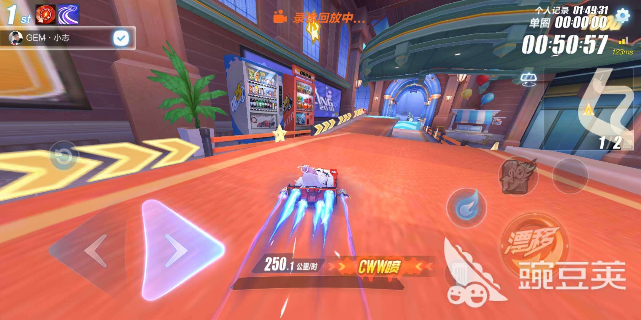 第四步:隨后就會(huì)遇見一個(gè)加速帶,在這里大家要記住用甩尾漂移銜接cww噴通過并且踩上加速帶通過這里,但是快到下面的彎道地方就要注意一下路線,避免拐彎漂移的時(shí)候撞墻,在這里大家運(yùn)用的技巧就是漂移銜接快速出彎然后銜接cw噴。