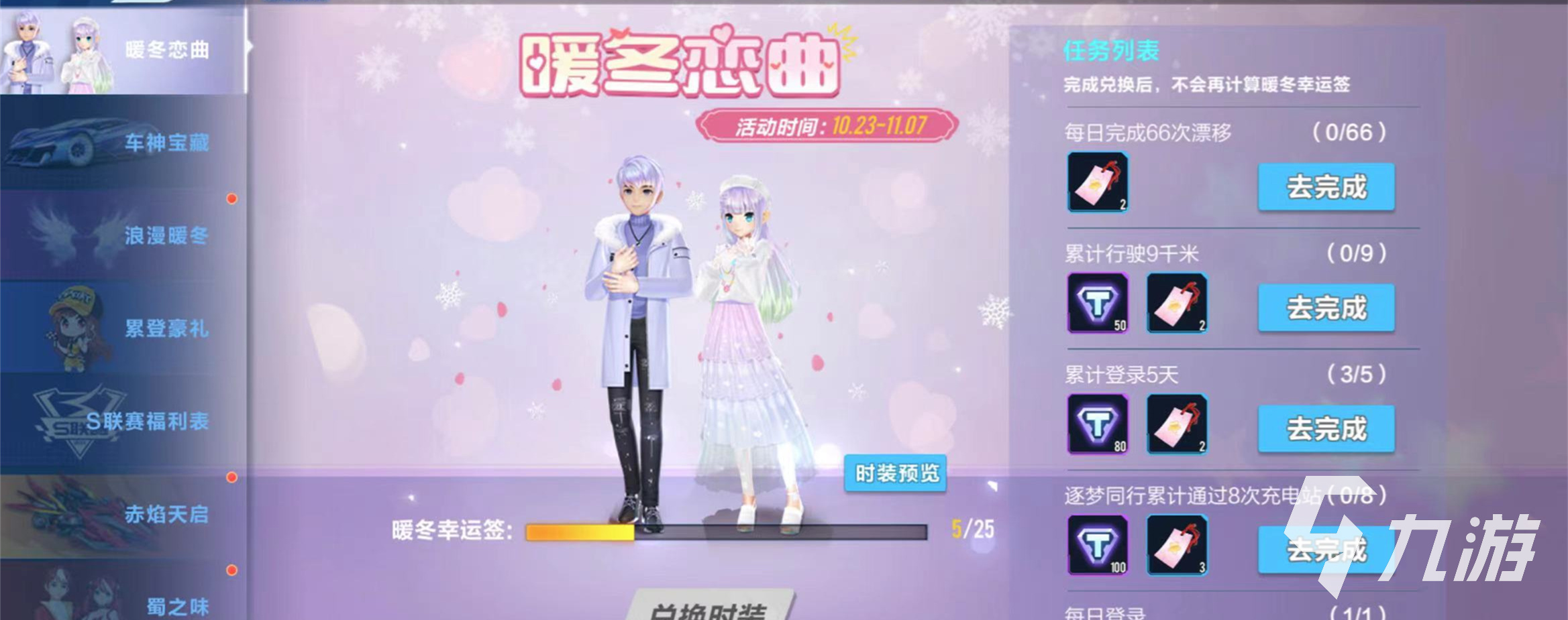 活動(dòng)時(shí)間為10月23日到11月7日,小伙伴可通過完成每日任務(wù)可獲得冬幸運(yùn)簽,當(dāng)集齊25個(gè)冬幸運(yùn)簽時(shí),就可以兌換永久的暖冬戀曲套裝。