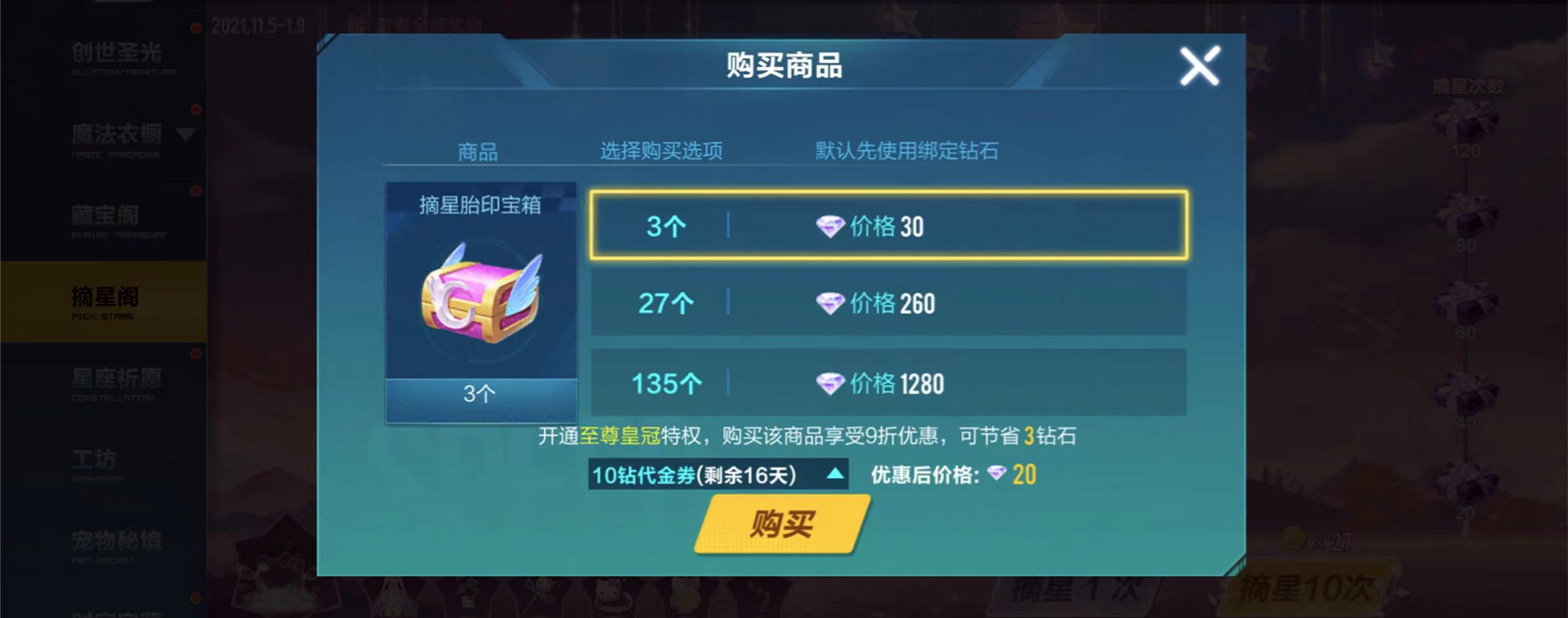 如果玩家覺(jué)得獲取的太慢,還可以進(jìn)行充值鉆石來(lái)轉(zhuǎn)換成摘星幣來(lái)進(jìn)行領(lǐng)取甜夢(mèng)凱蒂系列,開(kāi)通至尊皇冠特權(quán)購(gòu)買(mǎi)該商品還可以享受9折的優(yōu)惠,可節(jié)省3個(gè)鉆石,對(duì)于新手來(lái)說(shuō)相當(dāng)于福利啦,幸運(yùn)玩家興許還能開(kāi)出甜夢(mèng)凱蒂的戒指呦。