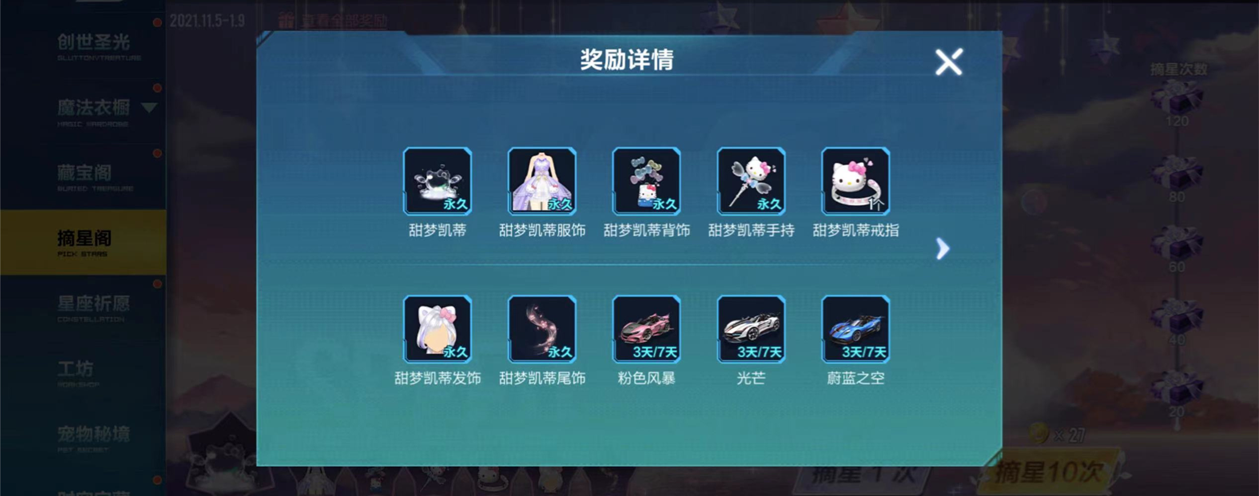 第二種獲取途徑請(qǐng)玩家點(diǎn)擊右上角的尋寶活動(dòng)進(jìn)入,在這里面有一系列的活動(dòng),每一種都不同,玩家可一直往下滑動(dòng),找到摘星閣,玩家需要用摘星的形式來(lái)進(jìn)行獲取甜夢(mèng)凱蒂系列的服飾和坐騎,每天有1次免費(fèi)的摘星,但情況不太理想,是抽不到的,第二種就是連續(xù)摘星10次,1次抽獎(jiǎng)必得粉色星星,在界面的右邊有一個(gè)摘星次數(shù)的基準(zhǔn)格,達(dá)到指定的點(diǎn)數(shù)可以開(kāi)出禮盒,達(dá)到20次摘星可以獲得獎(jiǎng)勵(lì),達(dá)到40次摘星可以獲得獎(jiǎng)勵(lì),以此類推,獲得的獎(jiǎng)品是摘星幣。