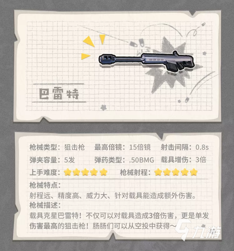 3、新武器上線:巴雷特,巴雷特的威名想必大家都清楚,作為狙擊槍里的王牌,在游戲中對載具造成的傷害更高哦,當(dāng)前玩家們只可以從空投內(nèi)獲取。