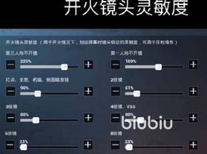 4、開火鏡頭靈敏度第三人稱不開鏡225%、第―人稱不開鏡169%紅點、全息、機瞄90%、2倍鏡61%、3倍鏡80%、4倍鏡、vss80%、6倍鏡223%、8倍鏡23%