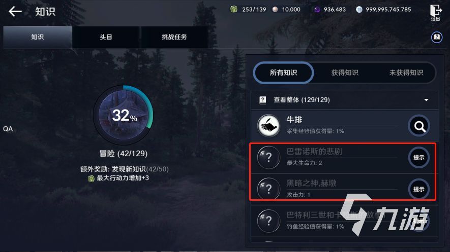 知識點:就有點類似成就的設(shè)定,大家在游戲中探索地圖從而了解到的各種頭目boss、食物、動植物等等。不同的地區(qū)達(dá)成100%探索可以得到一些稱號或者屬性加成。用特定方式擊殺一定數(shù)量的怪物、頭目,也可以豐富你的知識點。可能許多玩家對游戲知識點不是很在意,但其實這也是拉開普通玩家與大佬區(qū)別的地方??赡艹跗诓挥锰^于將重點放在這上面,路過就簡單做一做,大多是角色養(yǎng)成的差不多了,或者一天下來該做的都做了,才會投入一些精力在這上面。所謂積少成多,知識點給到的加成,累計在一起還是有差別的。當(dāng)然,如果你是那種打算長期慢慢玩的佛系玩家,那么也可以先做知識點。