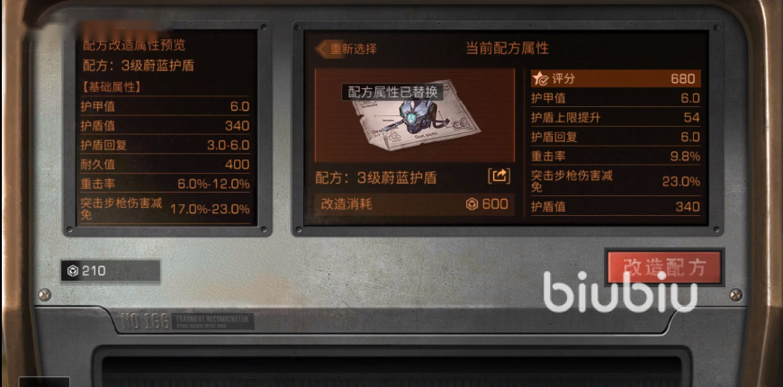 相比之下,在同樣評(píng)分的情況時(shí),3級(jí)蔚藍(lán)護(hù)盾的護(hù)盾血量只有340點(diǎn),耐久值和護(hù)盾回復(fù)能力方面二者沒有明顯的差別。但是3級(jí)蔚藍(lán)護(hù)盾要多出一個(gè)實(shí)戰(zhàn)特效:突擊步槍造成的傷害減免百分之十八。也就是說雖然3級(jí)蔚藍(lán)護(hù)盾的血量更低,但是在面對(duì)突擊步槍的傷害時(shí)有著比3級(jí)基礎(chǔ)護(hù)盾更高的防御能力。