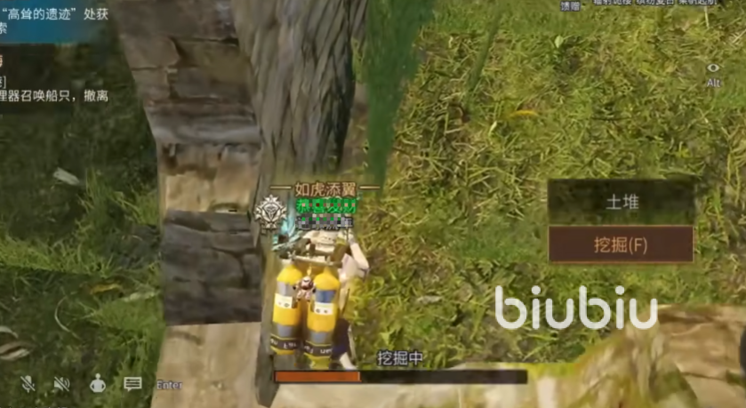 然后需要玩家爬山到達廢墟位置,這里還有兩個箱子,將外面的箱子拿完之后,跳進墻角就會觸發(fā)挖掘的按鈕,點擊就能將第二個寶箱挖出。