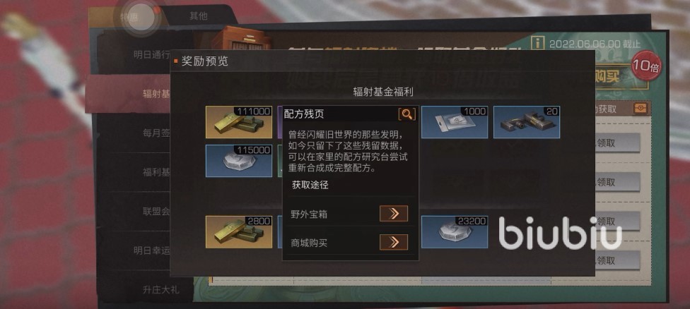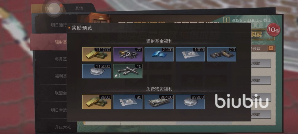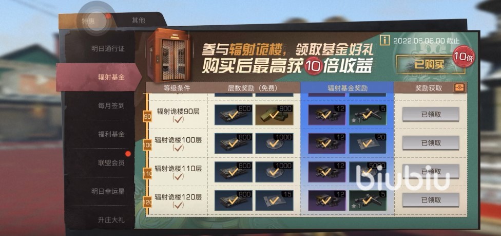 當然,這是免費獎勵,還有價值98元的基金獎勵,這個截止時間是2022年的6月6日,而伴隨著輻射詭樓的通關,可以解鎖更多的獎勵。