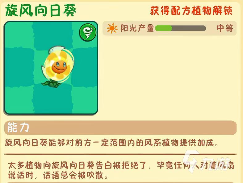 除了吹走僵尸和迷霧之外,三葉草還可以作為合成的材料,然后得到更為強(qiáng)悍的進(jìn)階植物。在戰(zhàn)斗中通過(guò)和其他植物疊加種植,就可以獲得進(jìn)化之后的其他風(fēng)系植物,目前主要有4種合成途徑。第1種是旋風(fēng)豌豆,三葉草和豌豆射手融合之后就能得到,可發(fā)射旋轉(zhuǎn)子彈,能穿透多個(gè)目標(biāo),傷害中等,但是攻速很快,適合對(duì)付成排的僵尸。三葉草和向日葵融合在一起,可以產(chǎn)生旋風(fēng)向日葵,釋放出旋風(fēng)擊退僵尸,同時(shí)生產(chǎn)陽(yáng)光。旋風(fēng)向日葵攻擊范圍比較大,冷卻時(shí)間中等。