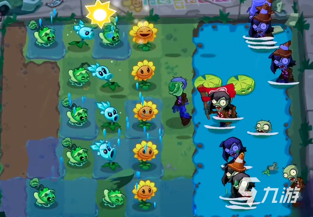 這個(gè)是屬于中后期的關(guān)卡了。此關(guān)是有著較小的池塘,這點(diǎn)需要玩家們小心一點(diǎn)才行。一開始玩家們需要先種植兩個(gè)向日葵來收集陽光,這一關(guān)我們的陽光在前期是非常少的。所以需要多收集一些陽光才行。關(guān)卡初期有贈(zèng)送我們兩個(gè)蓮葉,但是一開始的僵尸都不會(huì)從那兩處蓮葉過來。前面我們至少擁有3個(gè)以上的陽光才行,然后在池子中間的位置放置一個(gè)蓮葉來進(jìn)行阻擋。在蓮葉的后面建議放上一個(gè)冰凍豌豆。這樣可以有效的對(duì)付這條路上的敵人。接下來第一條路的水池需要放置一個(gè)蓮葉。