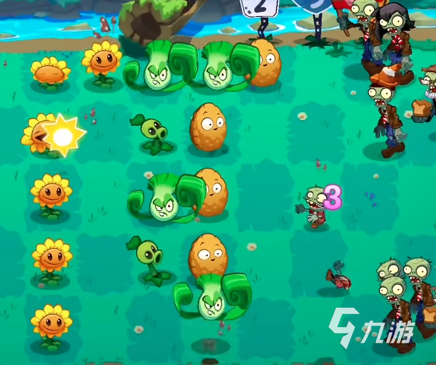 一開始首先老樣子去種植向日葵來進(jìn)行陽光的收集。玩家們最好將向日葵都種在最后一排。接下來等陽光收集到一定的程度便需要在第一排的中間或者是靠前的地方種下一個(gè)菜問。因?yàn)楹芸毂銜?huì)有敵人會(huì)從第一行過來。記得在菜問的前面放置一個(gè)堅(jiān)果,因?yàn)樵诮┦蠛芸毂銜?huì)有鴿子前來,沒有堅(jiān)果阻攔的話是很難對(duì)付的。接下來在所有沒有堅(jiān)果的路上前面放置堅(jiān)果。之后陸陸續(xù)續(xù)會(huì)有不少鴿子出現(xiàn)。我們只要守住了這兩波的話,后面只需要不斷的增加植物便可以順利通過關(guān)卡了。