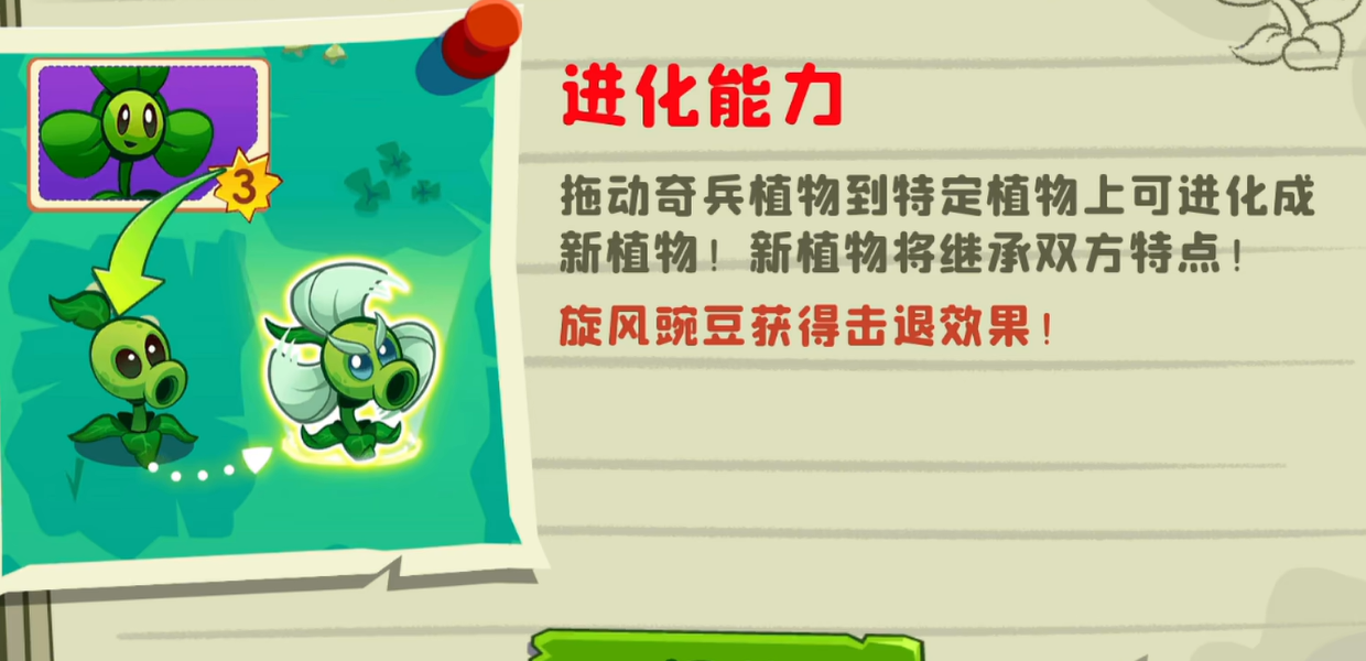 當(dāng)大家玩到這一章時(shí)就會(huì)解鎖新的功能,也就是進(jìn)化能力。拖動(dòng)奇兵植物到特定植物上可進(jìn)化成新植物!然后新植物將繼承雙方特點(diǎn),也就是說(shuō)可以將兩個(gè)植物的能力組合在一起,例如豌豆射手將獲得擊退敵方僵尸的功能。